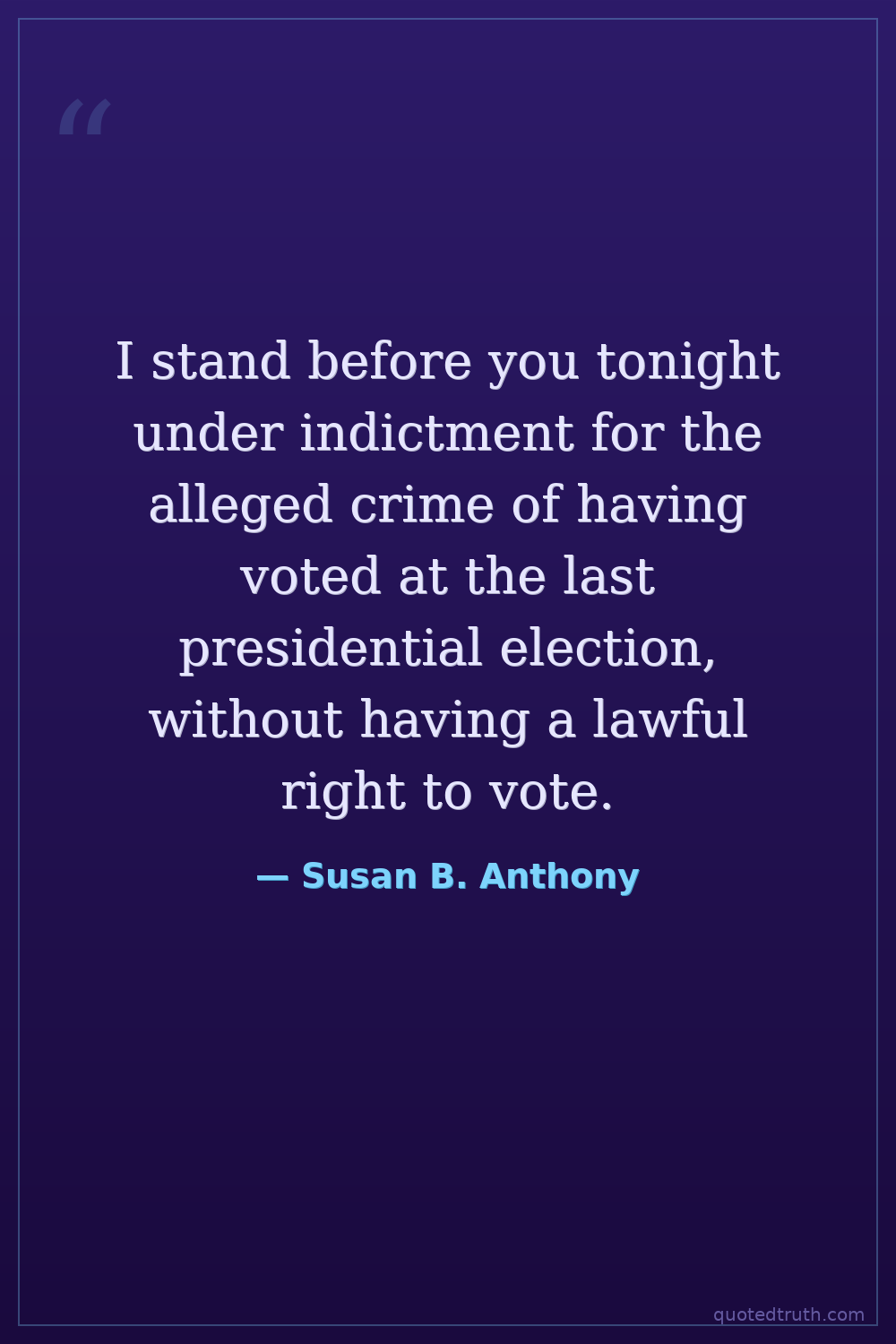 I stand before you tonight under indictment for the alleged crime of having voted at the last presidential election, without having a lawful right to vote.