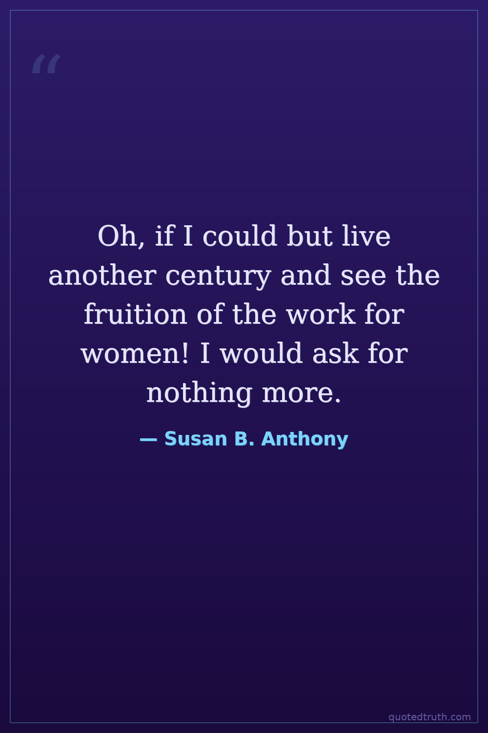 Oh, if I could but live another century and see the fruition of the work for women! I would ask for nothing more.