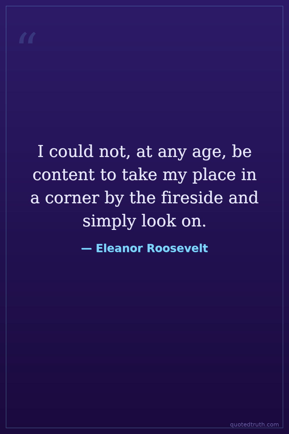 I could not, at any age, be content to take my place in a corner by the fireside and simply look on.