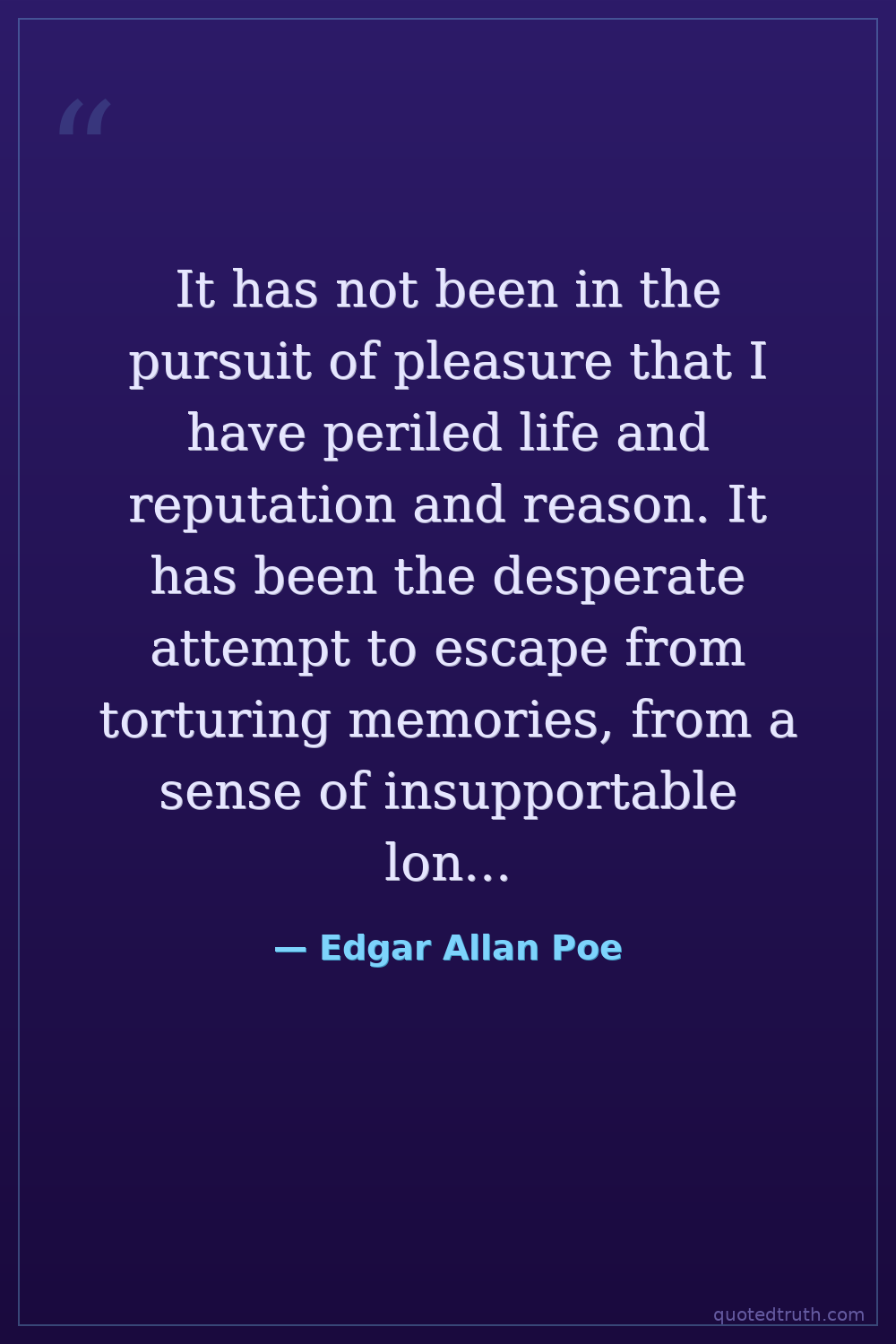 It has not been in the pursuit of pleasure that I have periled life and reputation and reason. It has been the desperate attempt to escape from torturing memories, from a sense of insupportable loneliness and a dread of some strange impending doom.