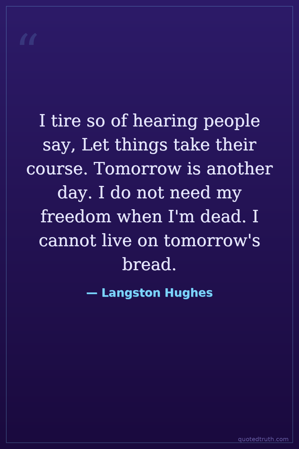 I tire so of hearing people say, Let things take their course. Tomorrow is another day. I do not need my freedom when I'm dead. I cannot live on tomorrow's bread.