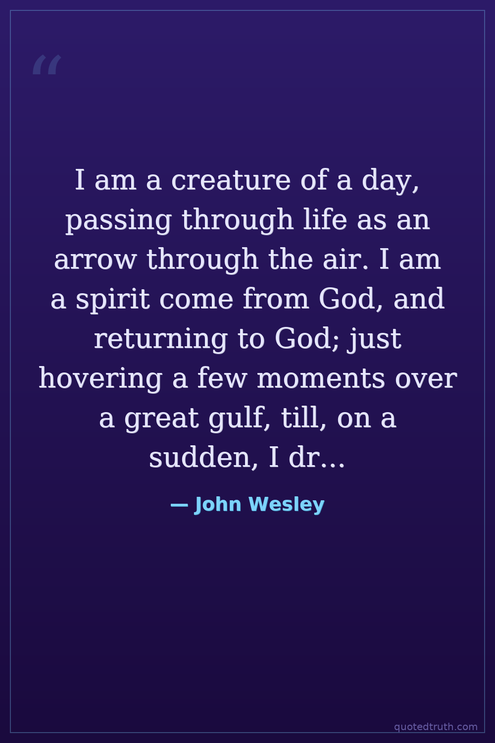 I am a creature of a day, passing through life as an arrow through the air. I am a spirit come from God, and returning to God; just hovering a few moments over a great gulf, till, on a sudden, I drop into an unchangeable eternity. I want to know one thing, the way to heaven; how to land safe on that happy shore. God Himself has condescended to teach the way; for this very end He came from heaven. He hath written it down in a book. O give me that book! At any price give me the Book of God! I have it: here is knowledge enough for me. Let me be homo unius libri.
