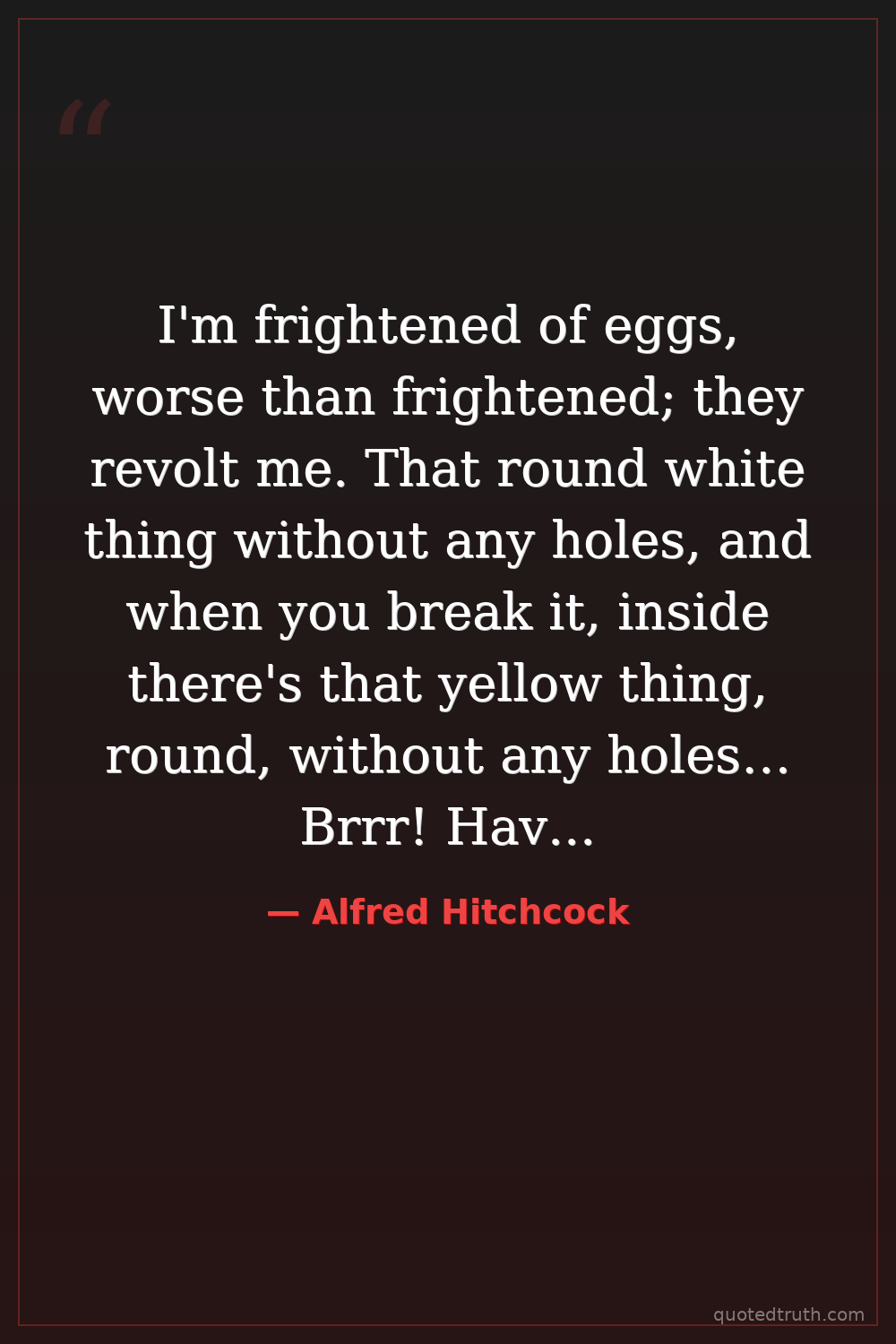 I'm frightened of eggs, worse than frightened; they revolt me. That round white thing without any holes, and when you break it, inside there's that yellow thing, round, without any holes… Brrr! Have you ever seen anything more revolting than an egg yolk breaking and spilling its yellow liquid? Blood is jolly, red. But egg yolk is yellow, revolting. I've never tasted it.