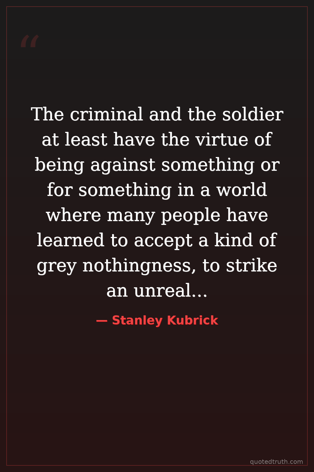 The criminal and the soldier at least have the virtue of being against something or for something in a world where many people have learned to accept a kind of grey nothingness, to strike an unreal series of poses in order to be considered normal…. It's difficult to say who is engaged in the greater conspiracy – the criminal, the soldier, or us.