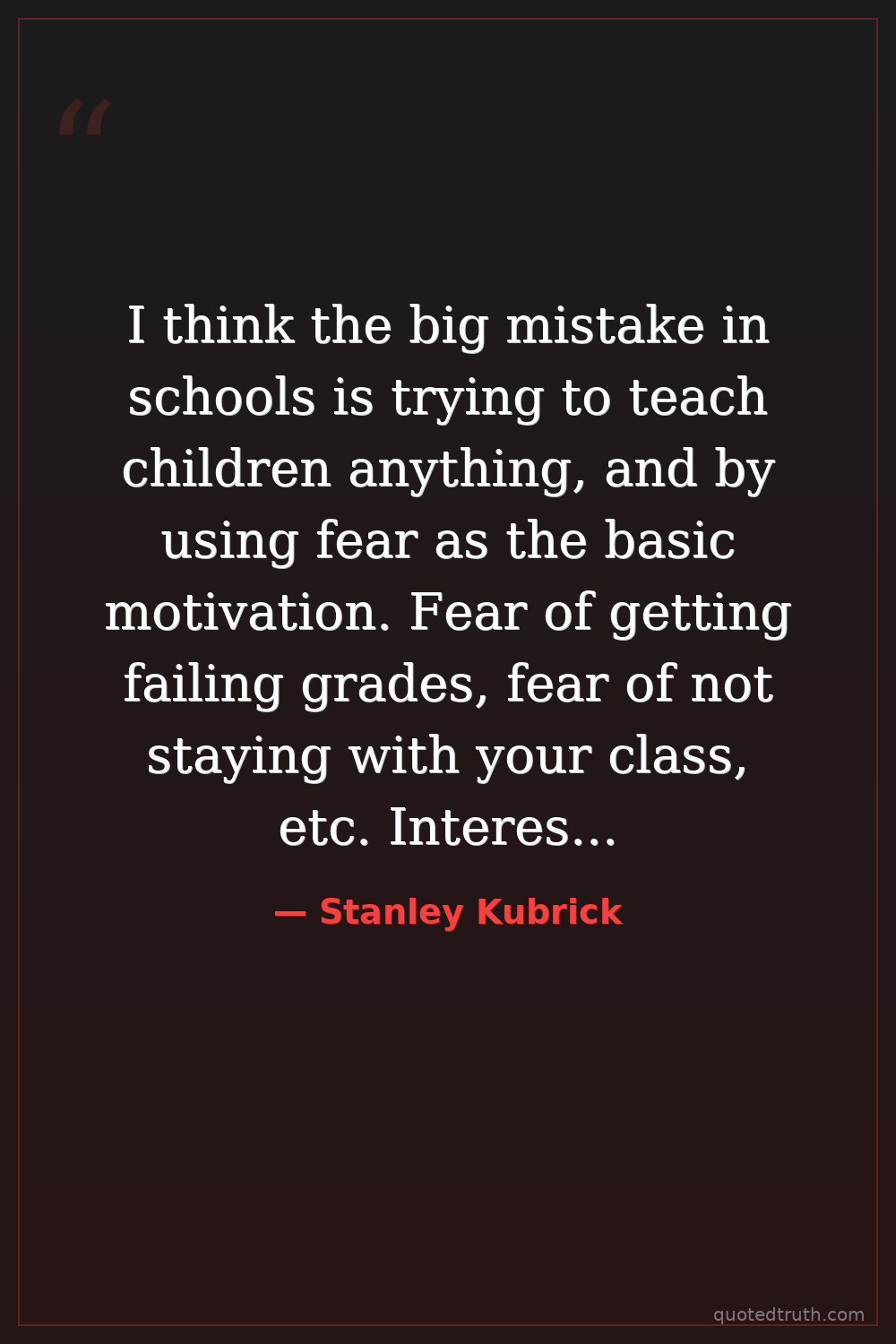 I think the big mistake in schools is trying to teach children anything, and by using fear as the basic motivation. Fear of getting failing grades, fear of not staying with your class, etc. Interest can produce learning on a scale compared to fear as a nuclear explosion to a firecracker.