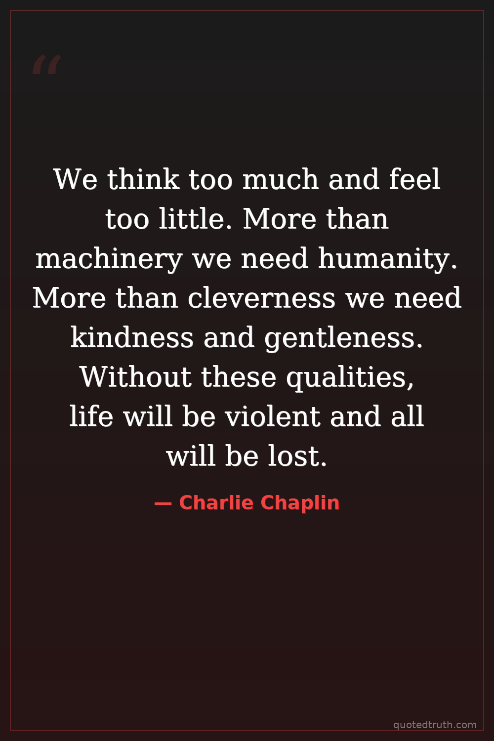 We think too much and feel too little. More than machinery we need humanity. More than cleverness we need kindness and gentleness. Without these qualities, life will be violent and all will be lost.