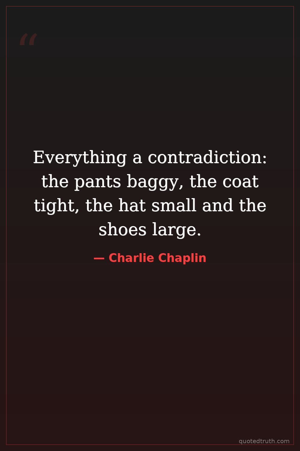 Everything a contradiction: the pants baggy, the coat tight, the hat small and the shoes large.