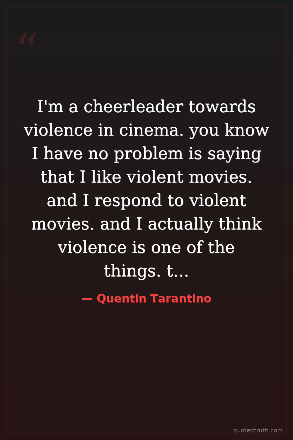 I'm a cheerleader towards violence in cinema. you know I have no problem is saying that I like violent movies. and I respond to violent movies. and I actually think violence is one of the things. that uh the Lumiere brothers helped invented the camera to do it's actually in some ways it's cinema reaching. its one of its fullest potentials.