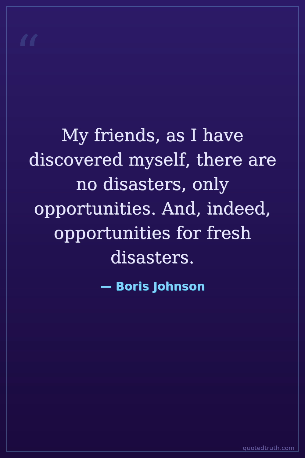 My friends, as I have discovered myself, there are no disasters, only opportunities. And, indeed, opportunities for fresh disasters.