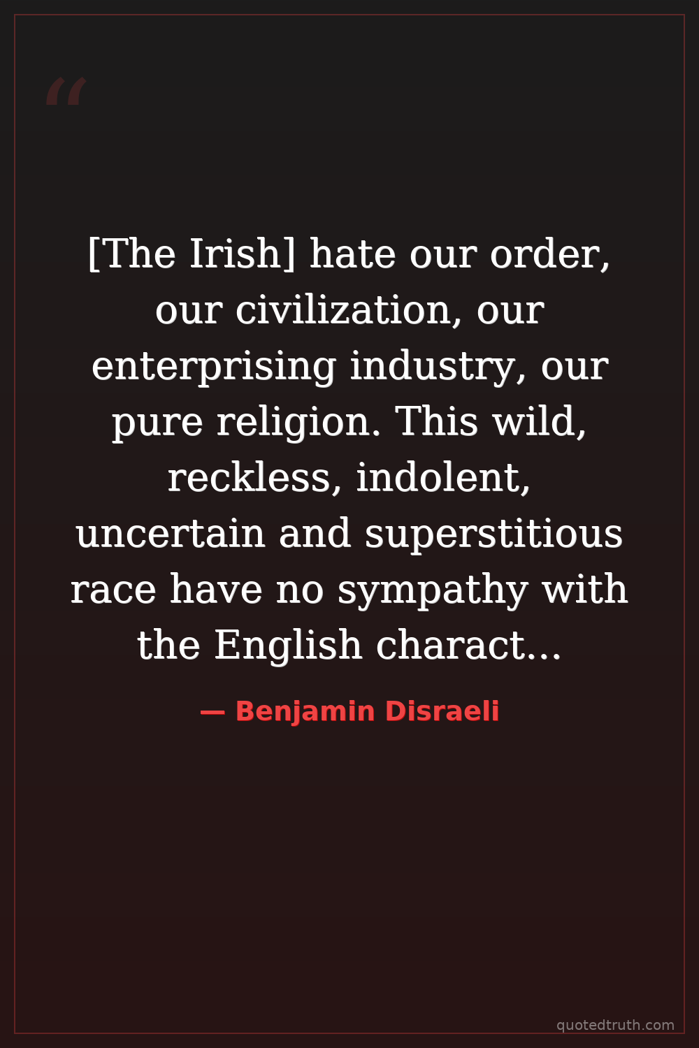 [The Irish] hate our order, our civilization, our enterprising industry, our pure religion. This wild, reckless, indolent, uncertain and superstitious race have no sympathy with the English character. Their ideal of human felicity is an alternation of clannish broils and coarse idolatry. Their history describes an unbroken circle of bigotry and blood.