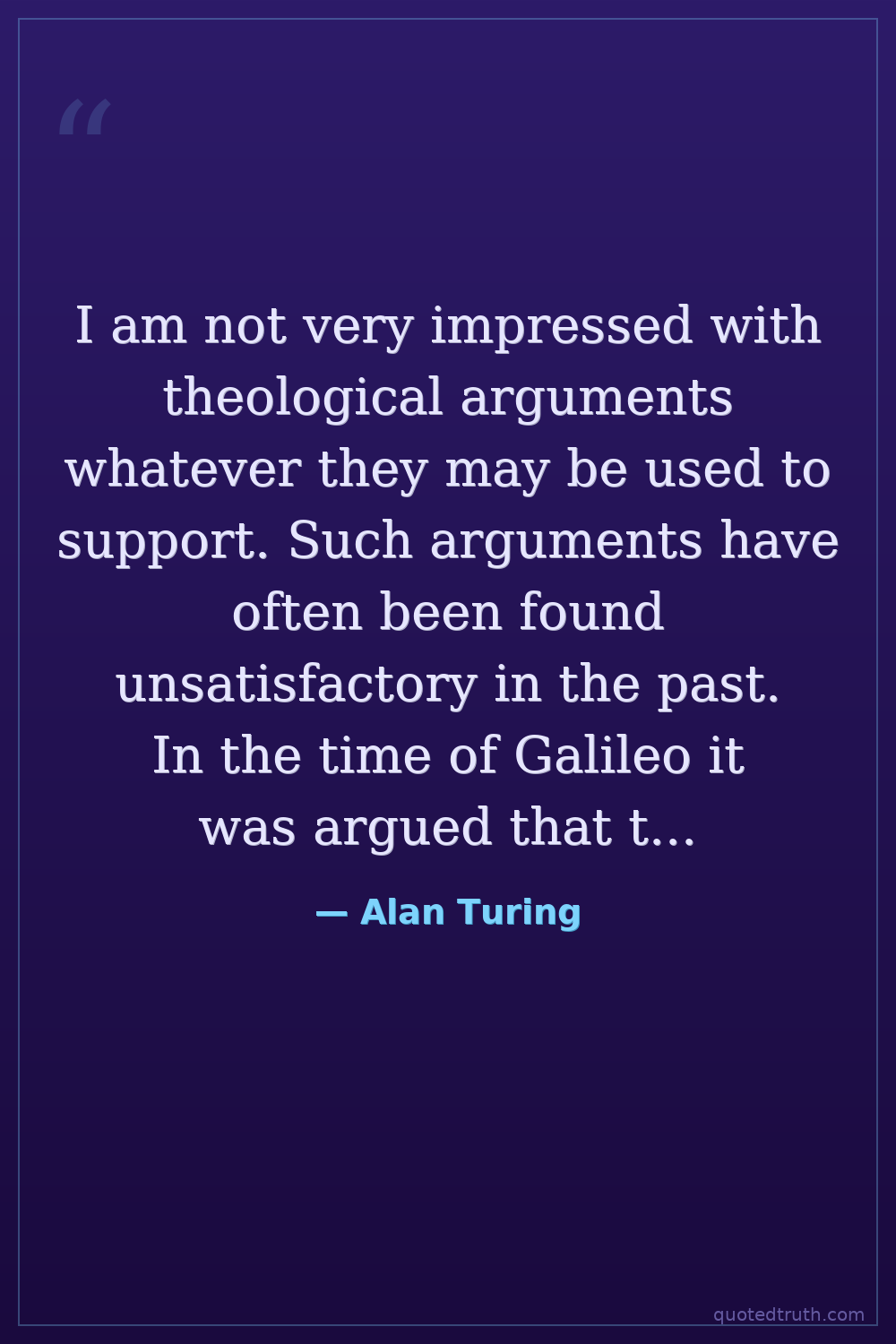 I am not very impressed with theological arguments whatever they may be used to support. Such arguments have often been found unsatisfactory in the past. In the time of Galileo it was argued that the texts, 'And the sun stood still... and hasted not to go down about a whole day' (Joshua x. 13) and 'He laid the foundations of the earth, that it should not move at any time' (Psalm cv. 5) were an adequate refutation of the Copernican theory.
