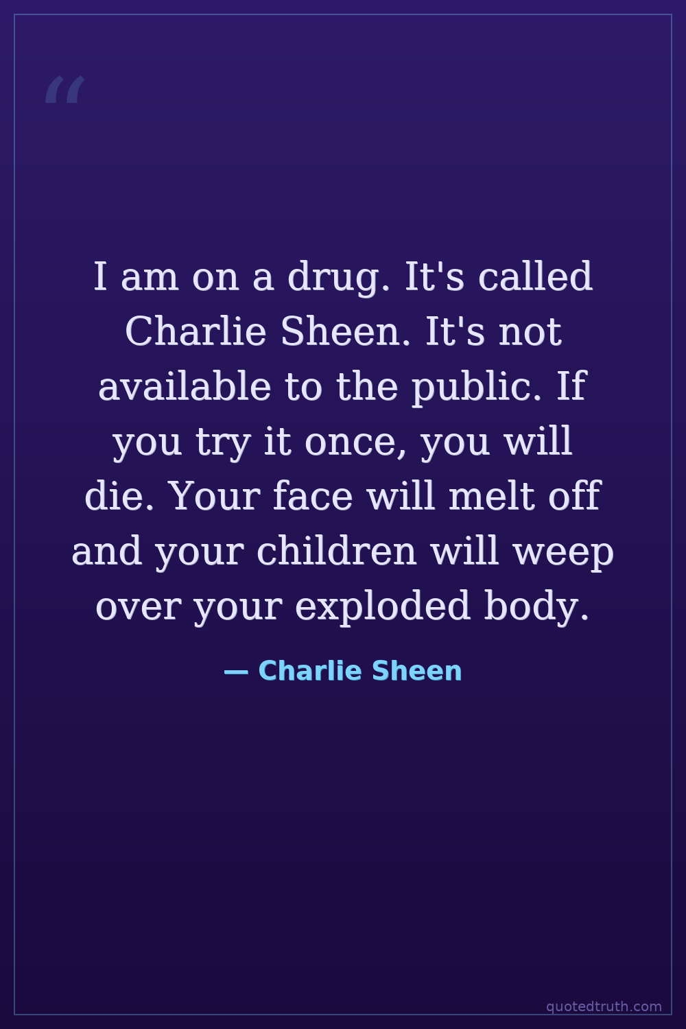 I am on a drug. It's called Charlie Sheen. It's not available to the public. If you try it once, you will die. Your face will melt off and your children will weep over your exploded body.