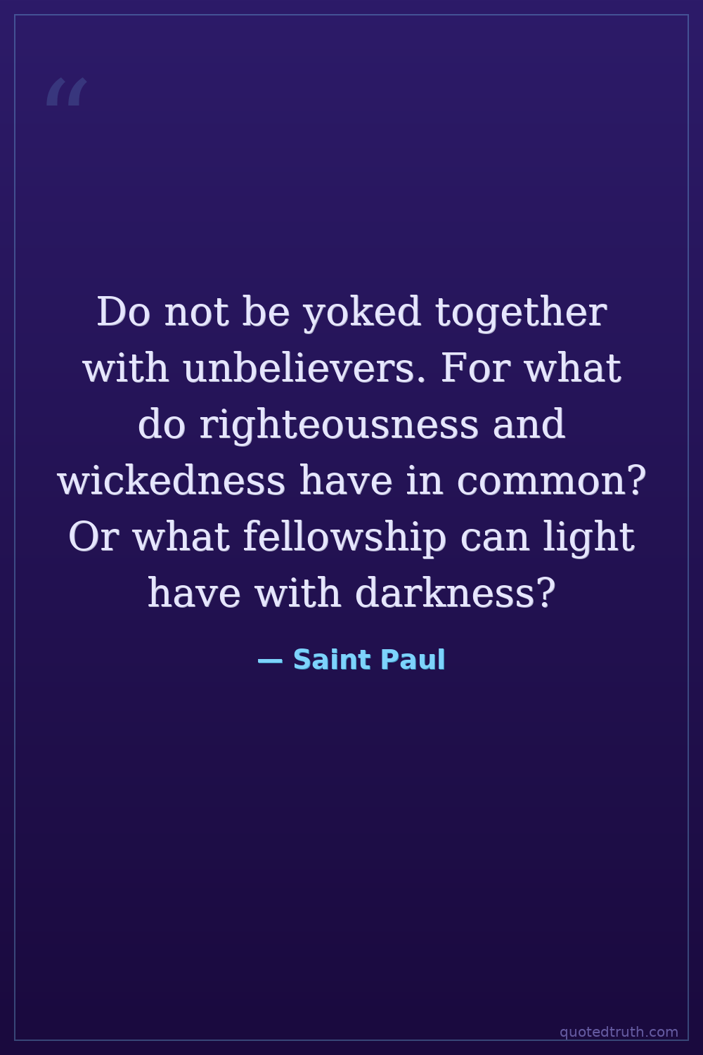Do not be yoked together with unbelievers. For what do righteousness and wickedness have in common? Or what fellowship can light have with darkness?
