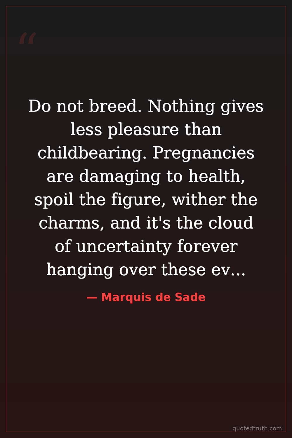 Do not breed. Nothing gives less pleasure than childbearing. Pregnancies are damaging to health, spoil the figure, wither the charms, and it's the cloud of uncertainty forever hanging over these events that darkens a husband's mood.