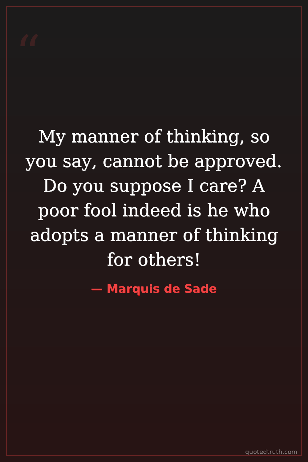 My manner of thinking, so you say, cannot be approved. Do you suppose I care? A poor fool indeed is he who adopts a manner of thinking for others!