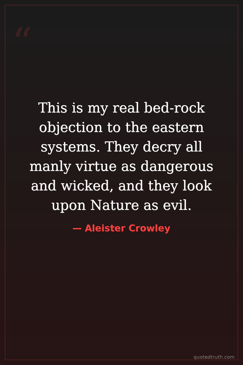 This is my real bed-rock objection to the eastern systems. They decry all manly virtue as dangerous and wicked, and they look upon Nature as evil.