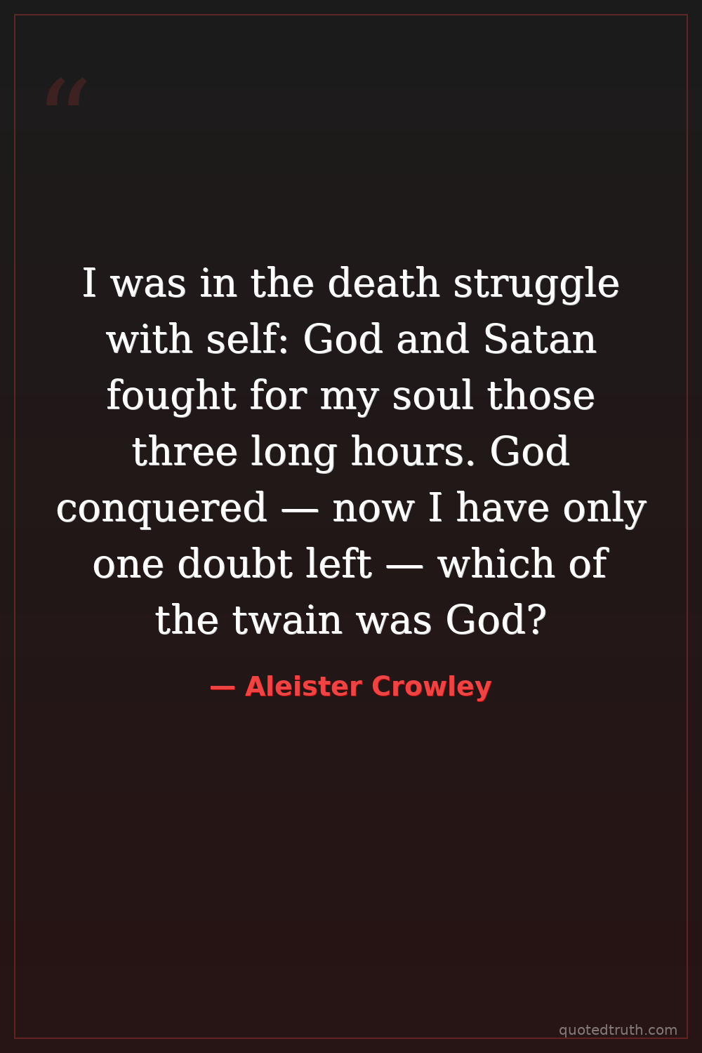 I was in the death struggle with self: God and Satan fought for my soul those three long hours. God conquered — now I have only one doubt left — which of the twain was God?