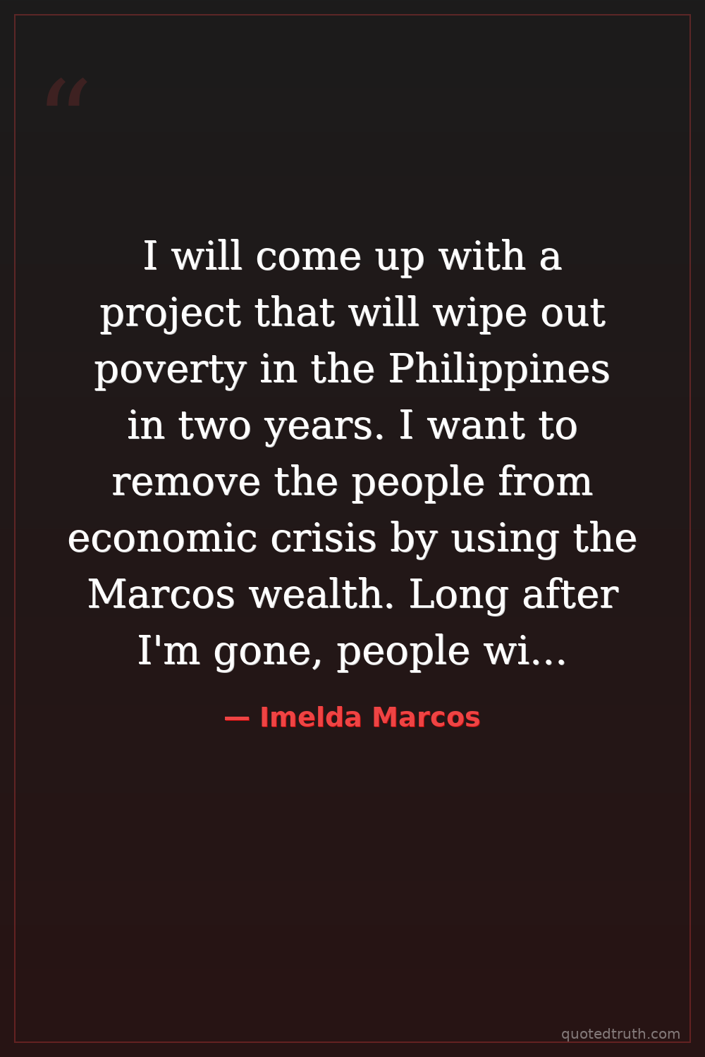 I will come up with a project that will wipe out poverty in the Philippines in two years. I want to remove the people from economic crisis by using the Marcos wealth. Long after I'm gone, people will remember me for building them homes and roads and hospitals and giving them food.