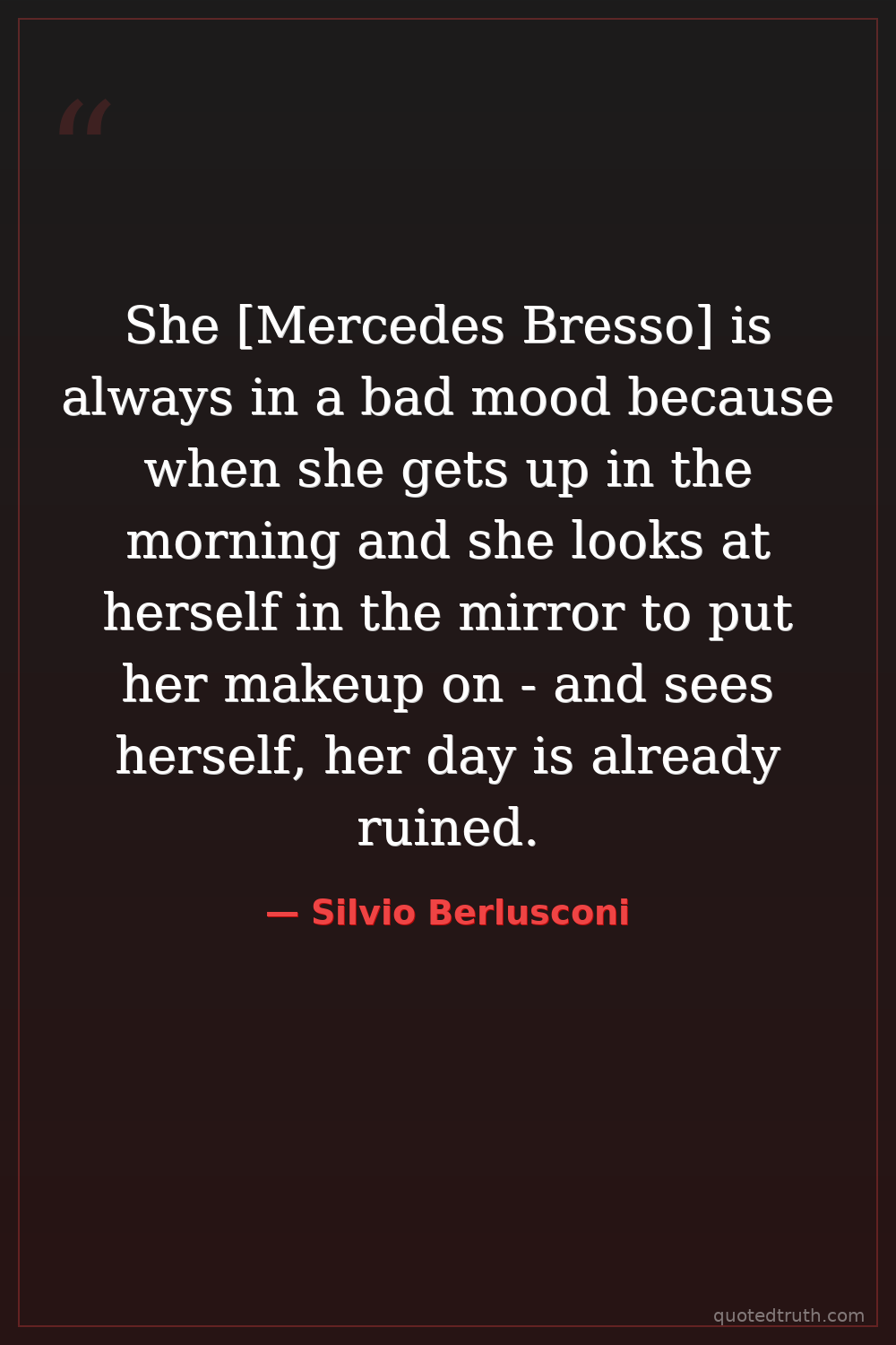 She [Mercedes Bresso] is always in a bad mood because when she gets up in the morning and she looks at herself in the mirror to put her makeup on - and sees herself, her day is already ruined.