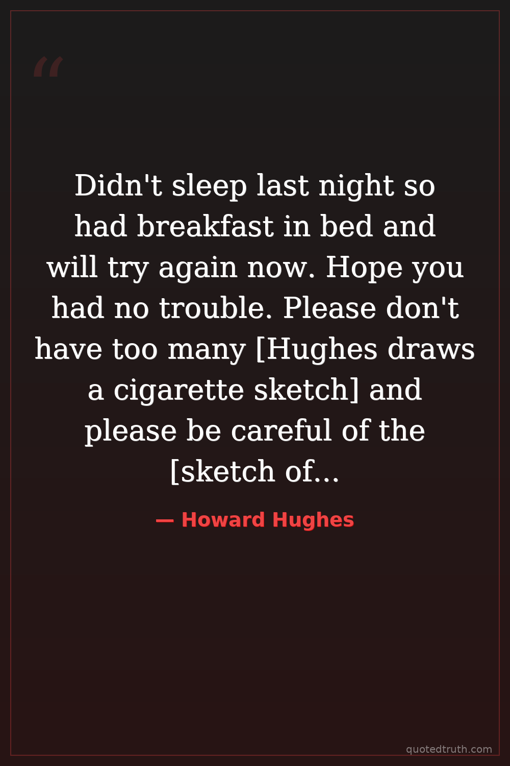 Didn't sleep last night so had breakfast in bed and will try again now. Hope you had no trouble. Please don't have too many [Hughes draws a cigarette sketch] and please be careful of the [sketch of a toilet].