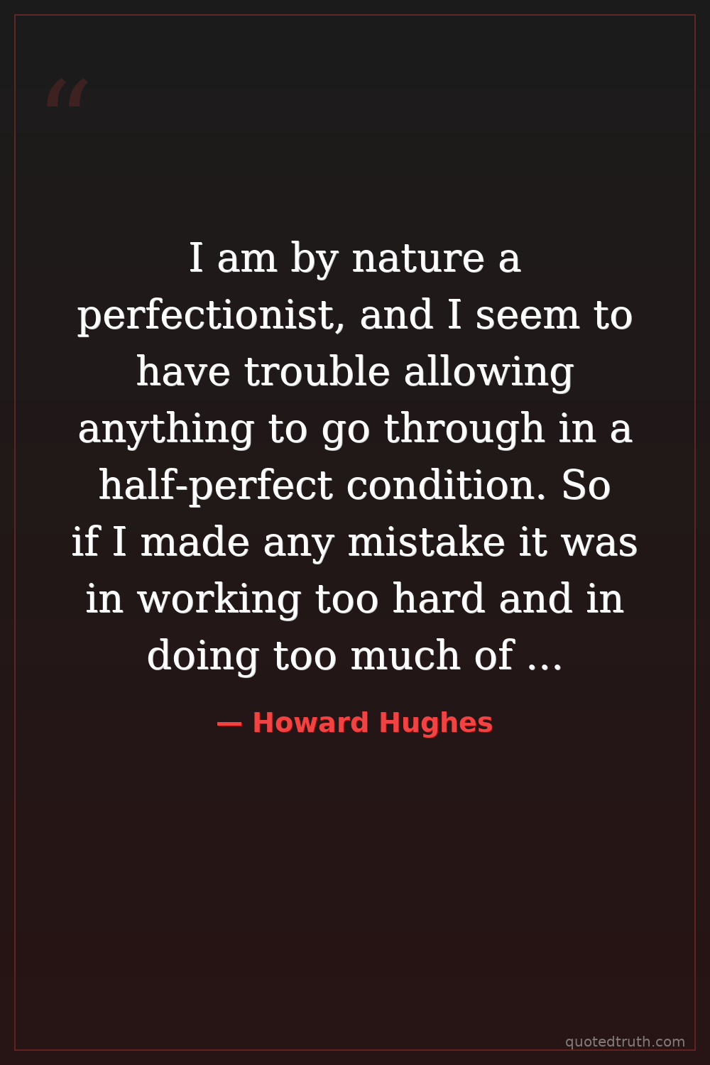 I am by nature a perfectionist, and I seem to have trouble allowing anything to go through in a half-perfect condition. So if I made any mistake it was in working too hard and in doing too much of it with my own hands. — Howard Hughes Contemporary Billionaire, extreme OCD recluse
