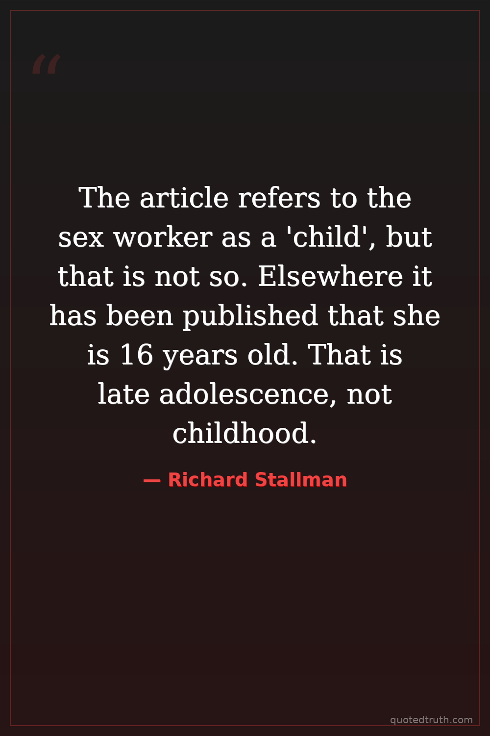 The article refers to the sex worker as a 'child', but that is not so. Elsewhere it has been published that she is 16 years old. That is late adolescence, not childhood.