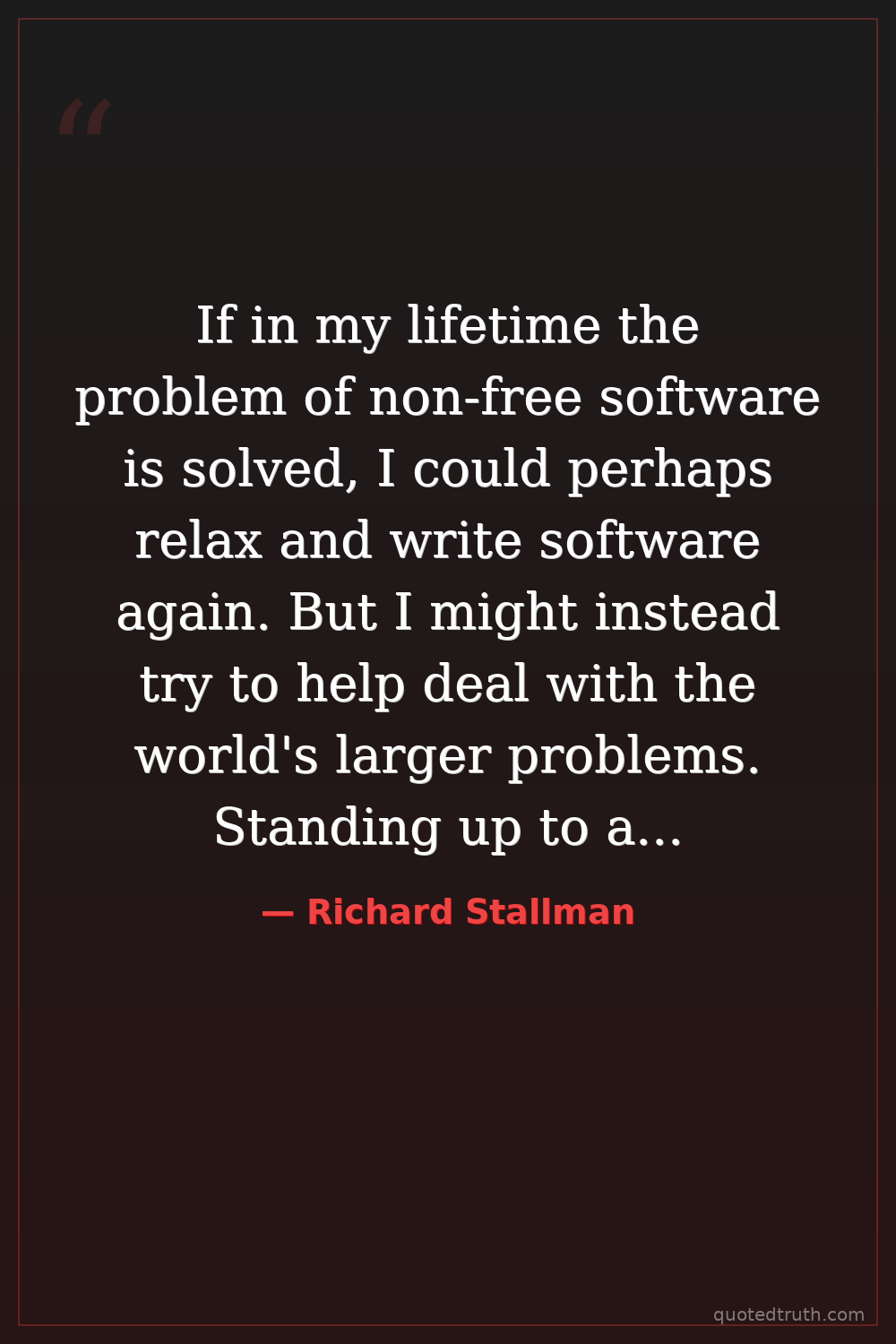 If in my lifetime the problem of non-free software is solved, I could perhaps relax and write software again. But I might instead try to help deal with the world's larger problems. Standing up to an evil system is exhilarating, and now I have a taste for it.