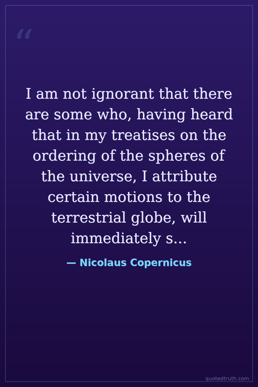 I am not ignorant that there are some who, having heard that in my treatises on the ordering of the spheres of the universe, I attribute certain motions to the terrestrial globe, will immediately shout that I and my opinion should be cast out.