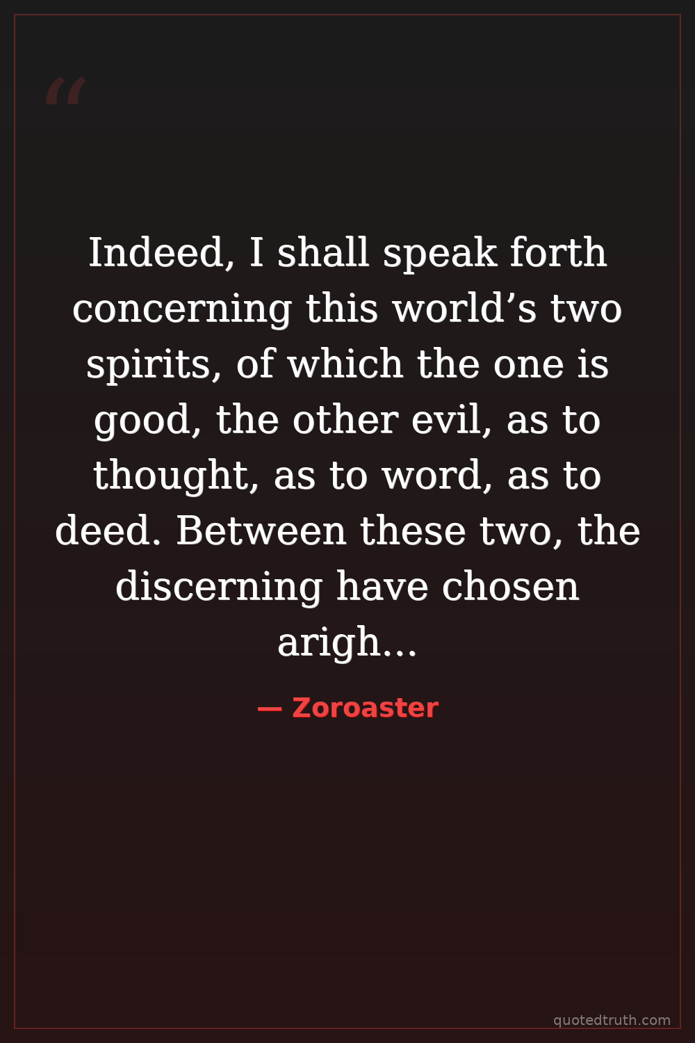 Indeed, I shall speak forth concerning this world’s two spirits, of which the one is good, the other evil, as to thought, as to word, as to deed. Between these two, the discerning have chosen aright, not so the undiscerning. — Zoroaster Ancient Founder of Zoroastrianism