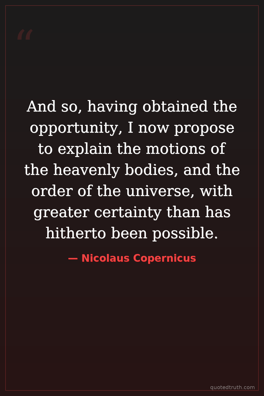 And so, having obtained the opportunity, I now propose to explain the motions of the heavenly bodies, and the order of the universe, with greater certainty than has hitherto been possible.