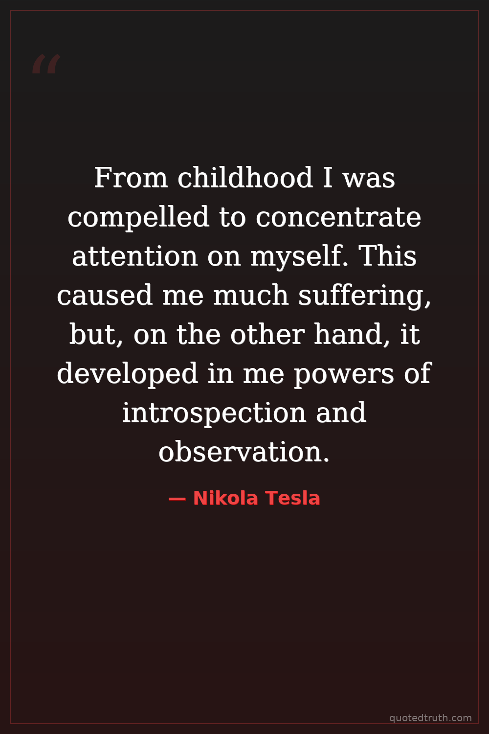 From childhood I was compelled to concentrate attention on myself. This caused me much suffering, but, on the other hand, it developed in me powers of introspection and observation.
