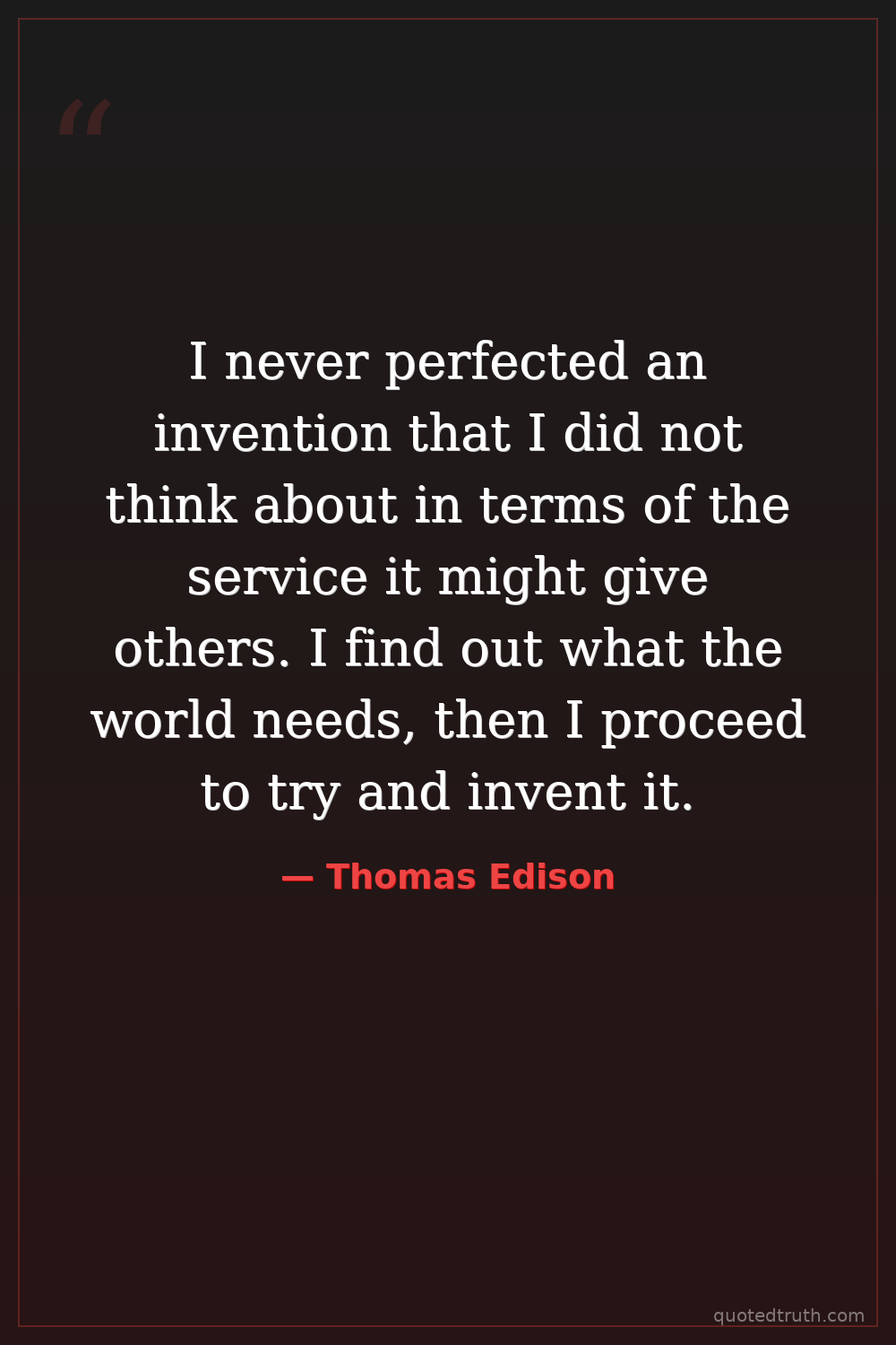 I never perfected an invention that I did not think about in terms of the service it might give others. I find out what the world needs, then I proceed to try and invent it.