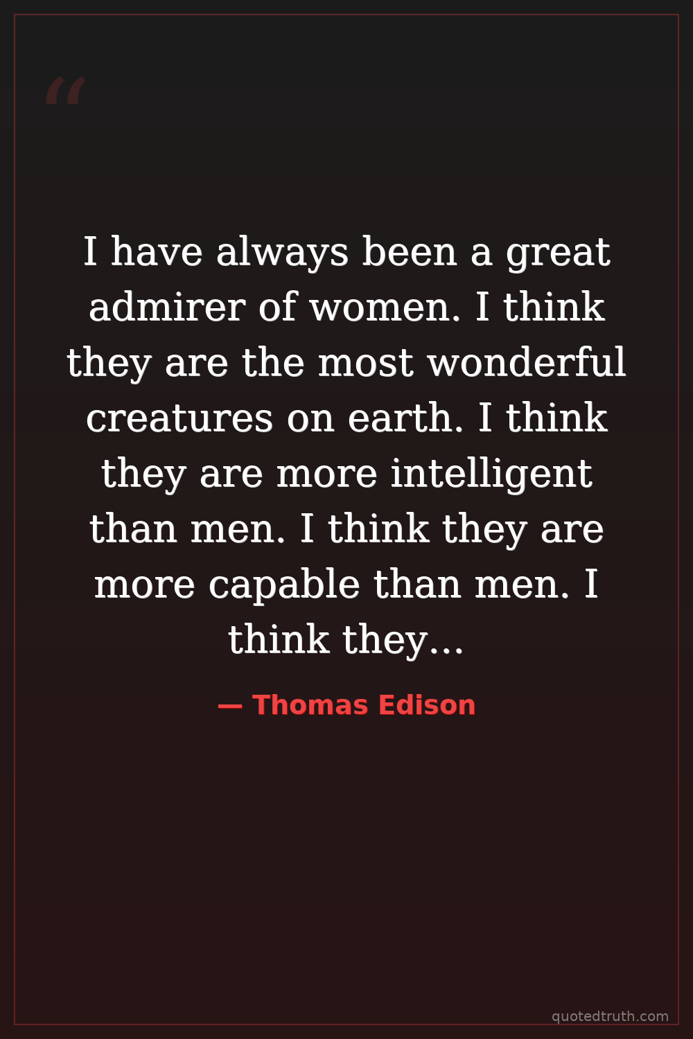 I have always been a great admirer of women. I think they are the most wonderful creatures on earth. I think they are more intelligent than men. I think they are more capable than men. I think they are more practical than men.