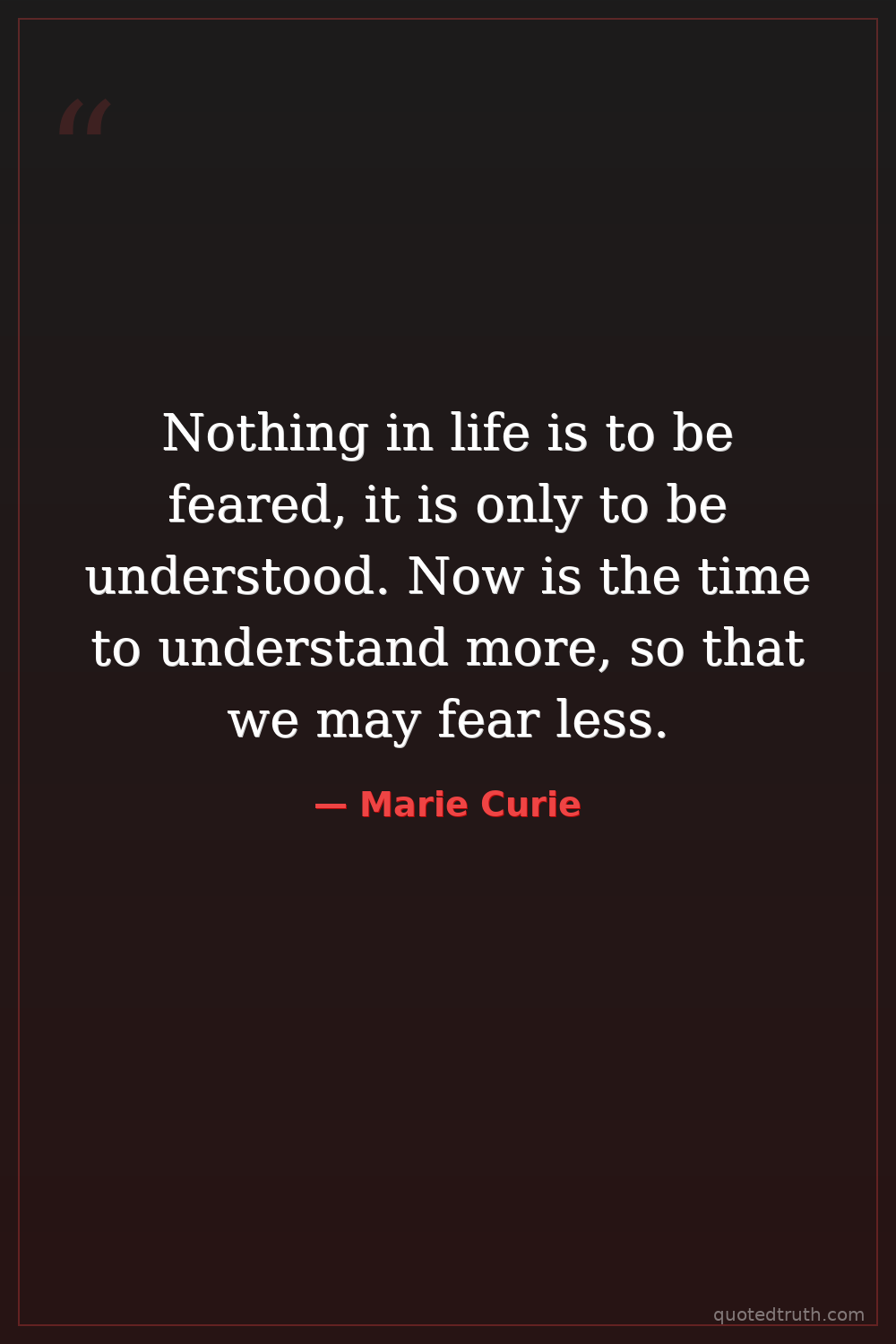 Nothing in life is to be feared, it is only to be understood. Now is the time to understand more, so that we may fear less.