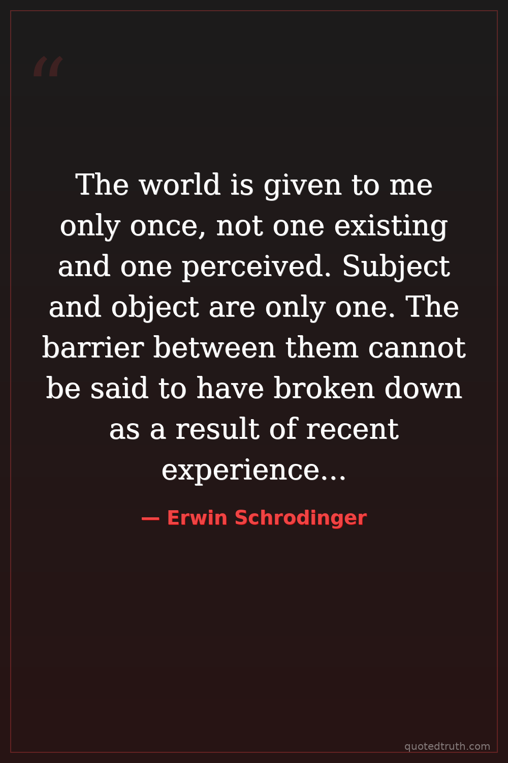 The world is given to me only once, not one existing and one perceived. Subject and object are only one. The barrier between them cannot be said to have broken down as a result of recent experience in the physical sciences, because that barrier does not exist.
