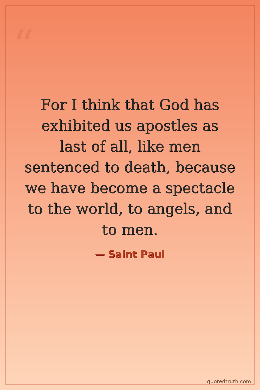 For I think that God has exhibited us apostles as last of all, like men sentenced to death, because we have become a spectacle to the world, to angels, and to men.