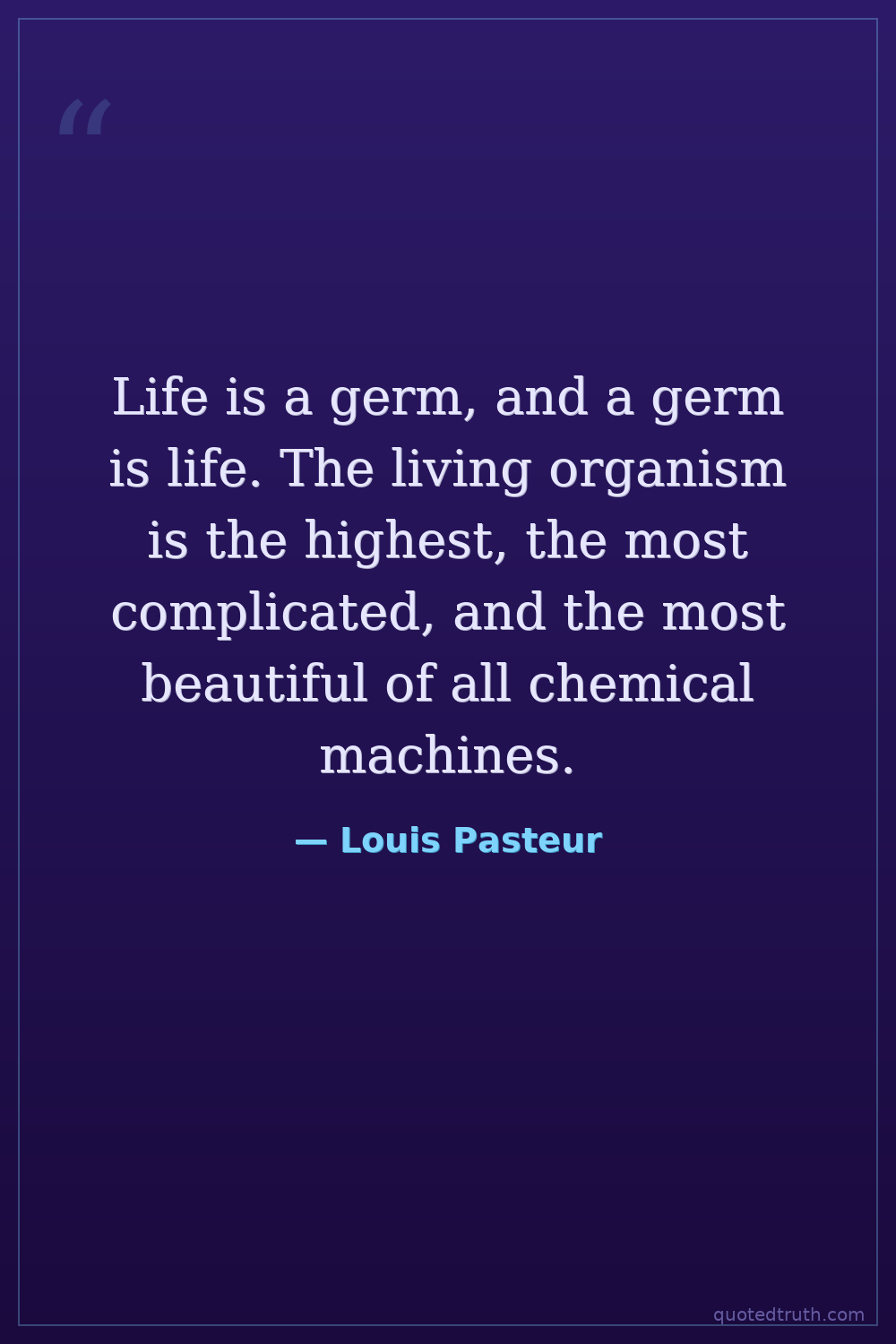 Life is a germ, and a germ is life. The living organism is the highest, the most complicated, and the most beautiful of all chemical machines.