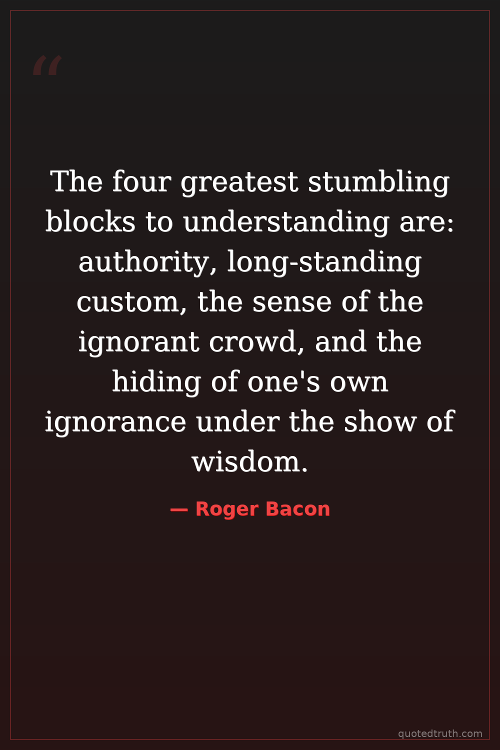 The four greatest stumbling blocks to understanding are: authority, long-standing custom, the sense of the ignorant crowd, and the hiding of one's own ignorance under the show of wisdom.