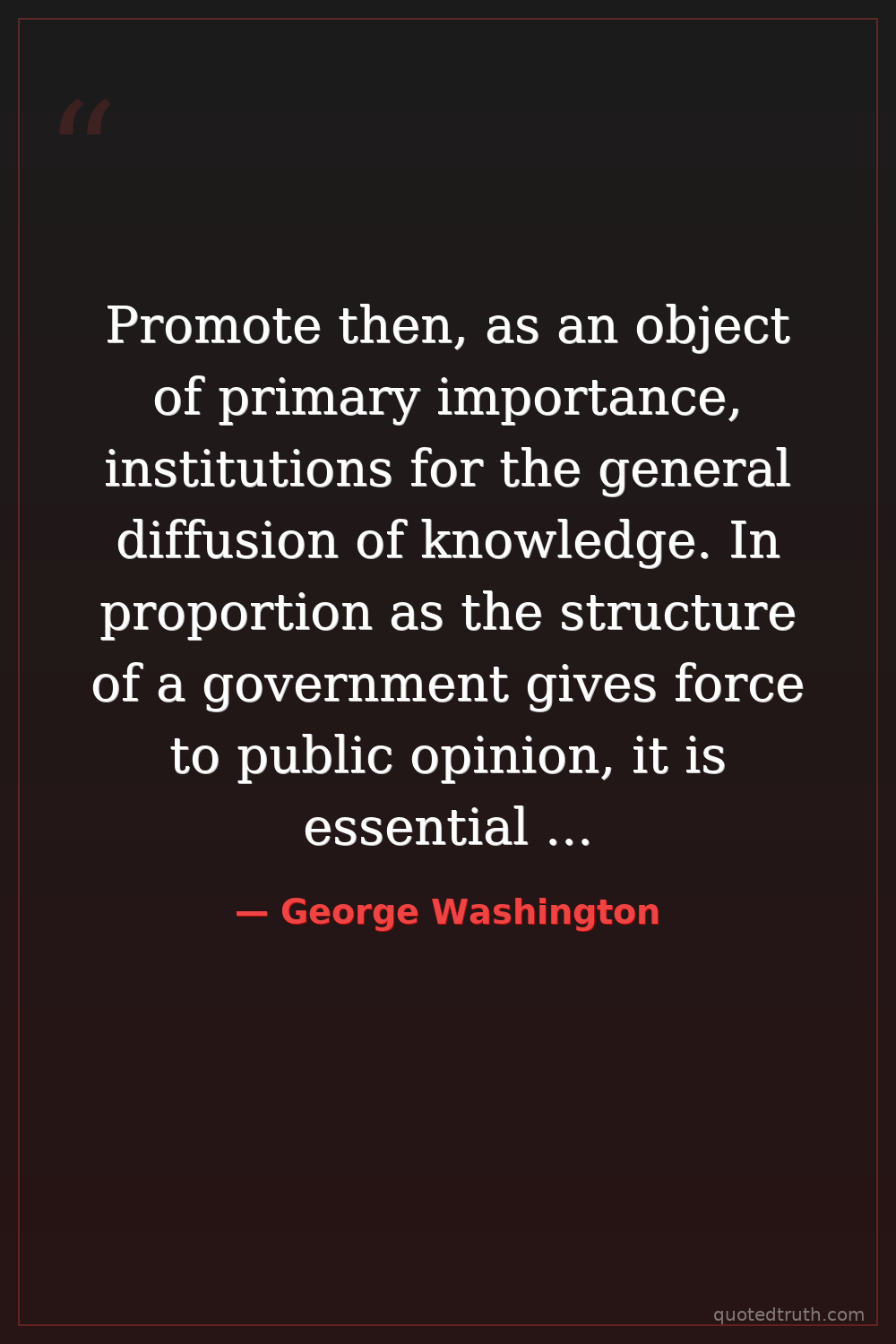 Promote then, as an object of primary importance, institutions for the general diffusion of knowledge. In proportion as the structure of a government gives force to public opinion, it is essential that public opinion should be enlightened.