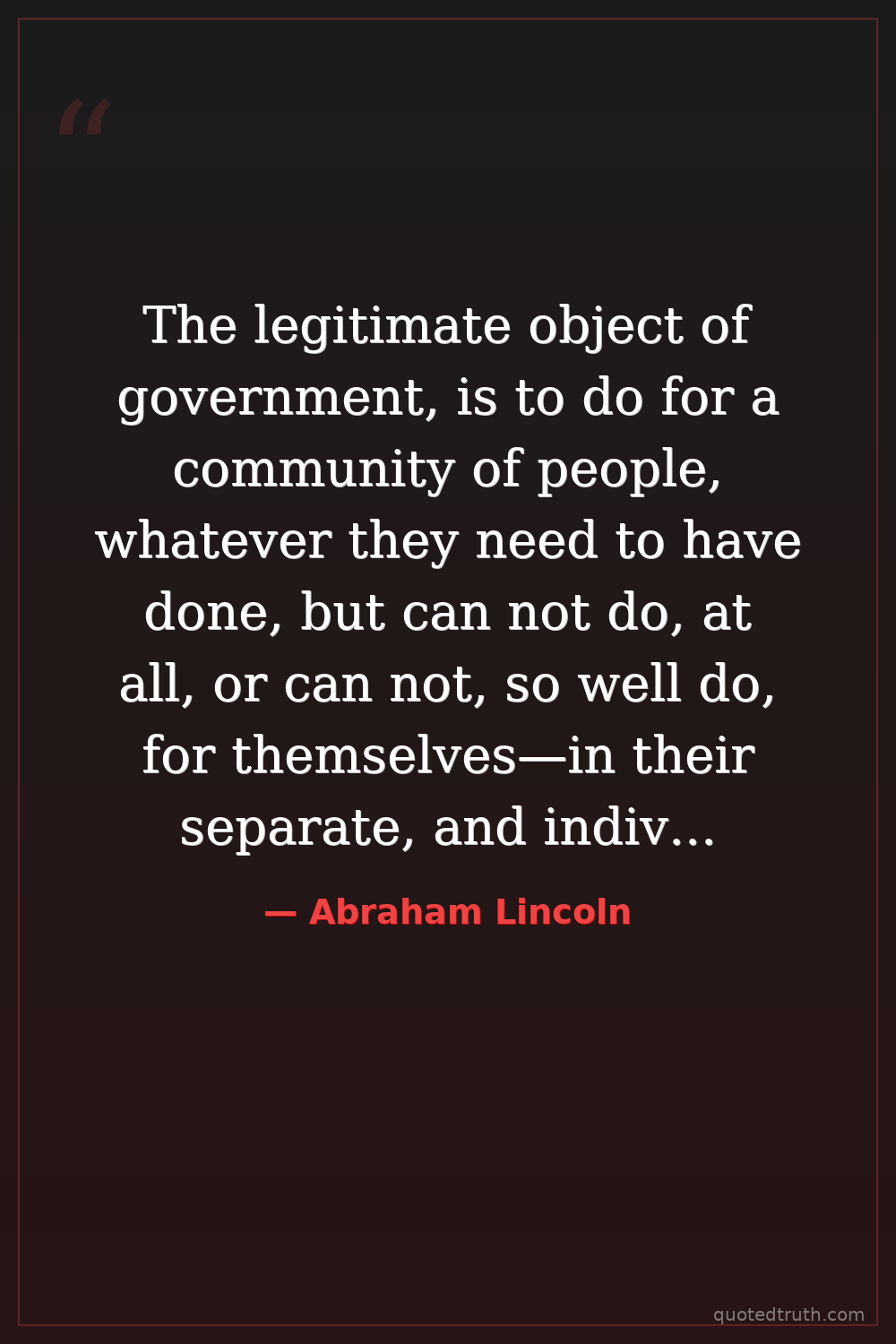 The legitimate object of government, is to do for a community of people, whatever they need to have done, but can not do, at all, or can not, so well do, for themselves—in their separate, and individual capacities.