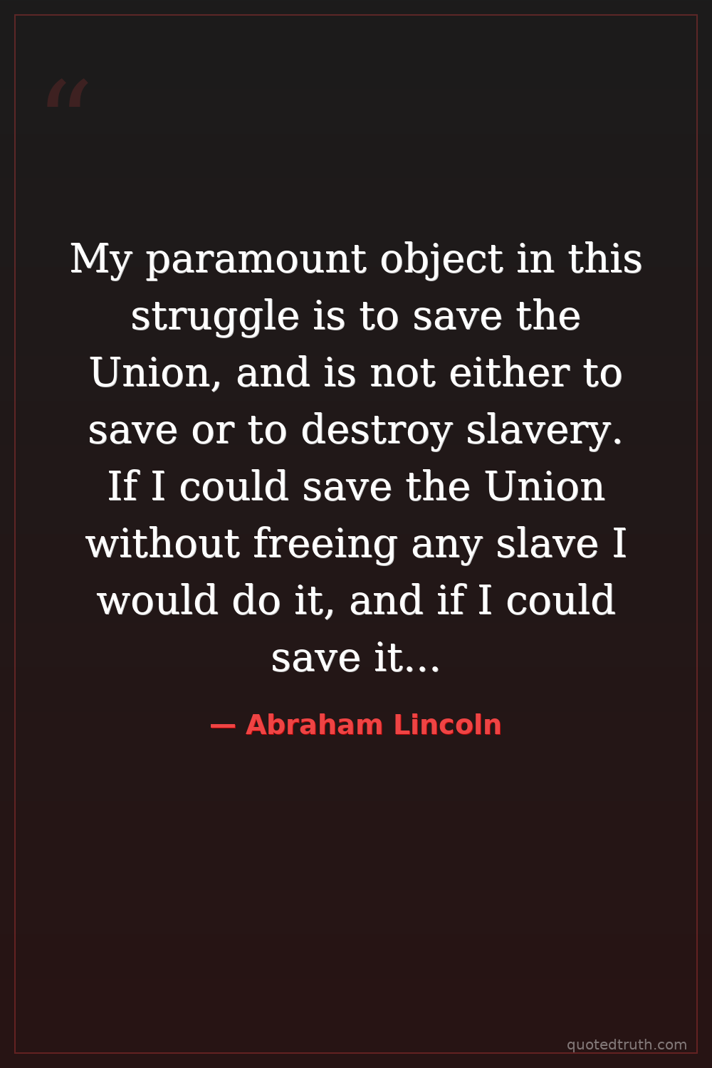 My paramount object in this struggle is to save the Union, and is not either to save or to destroy slavery. If I could save the Union without freeing any slave I would do it, and if I could save it by freeing all the slaves I would do it; and if I could save it by freeing some and leaving others alone I would also do that.