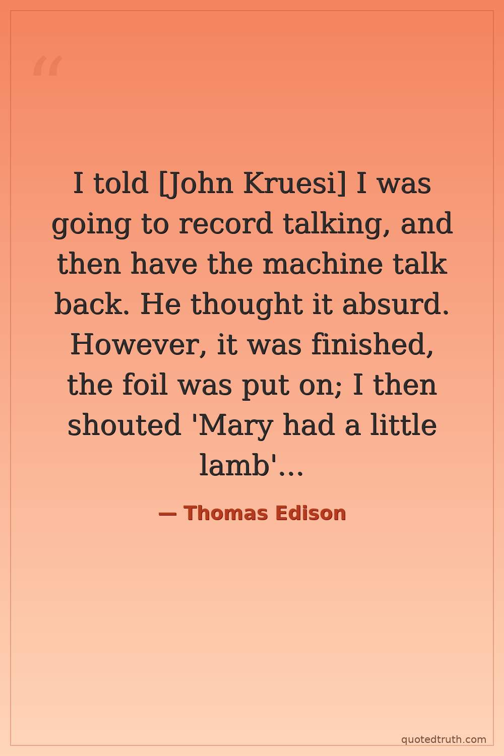 I told [John Kruesi] I was going to record talking, and then have the machine talk back. He thought it absurd. However, it was finished, the foil was put on; I then shouted 'Mary had a little lamb', etc.