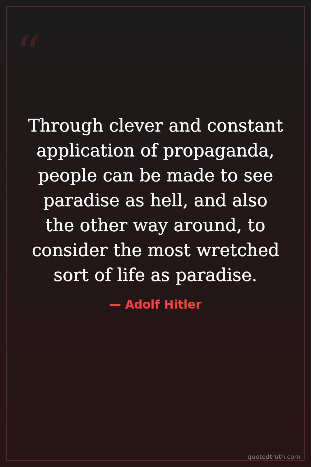Through clever and constant application of propaganda, people can be made to see paradise as hell, and also the other way around, to consider the most wretched sort of life as paradise.