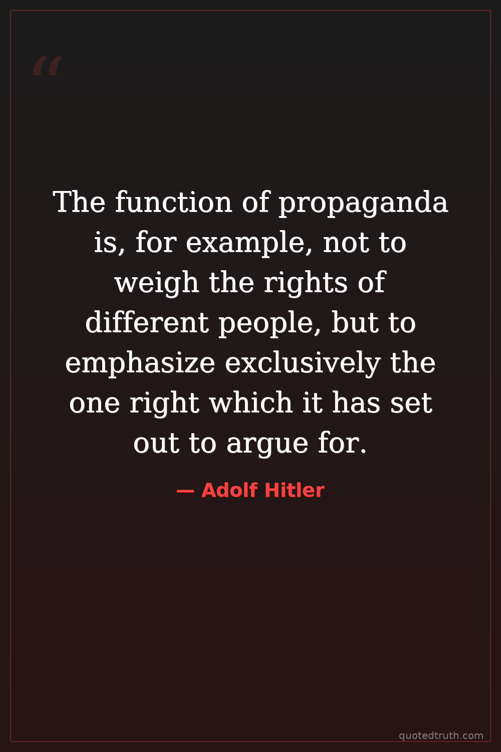 The function of propaganda is, for example, not to weigh the rights of different people, but to emphasize exclusively the one right which it has set out to argue for.