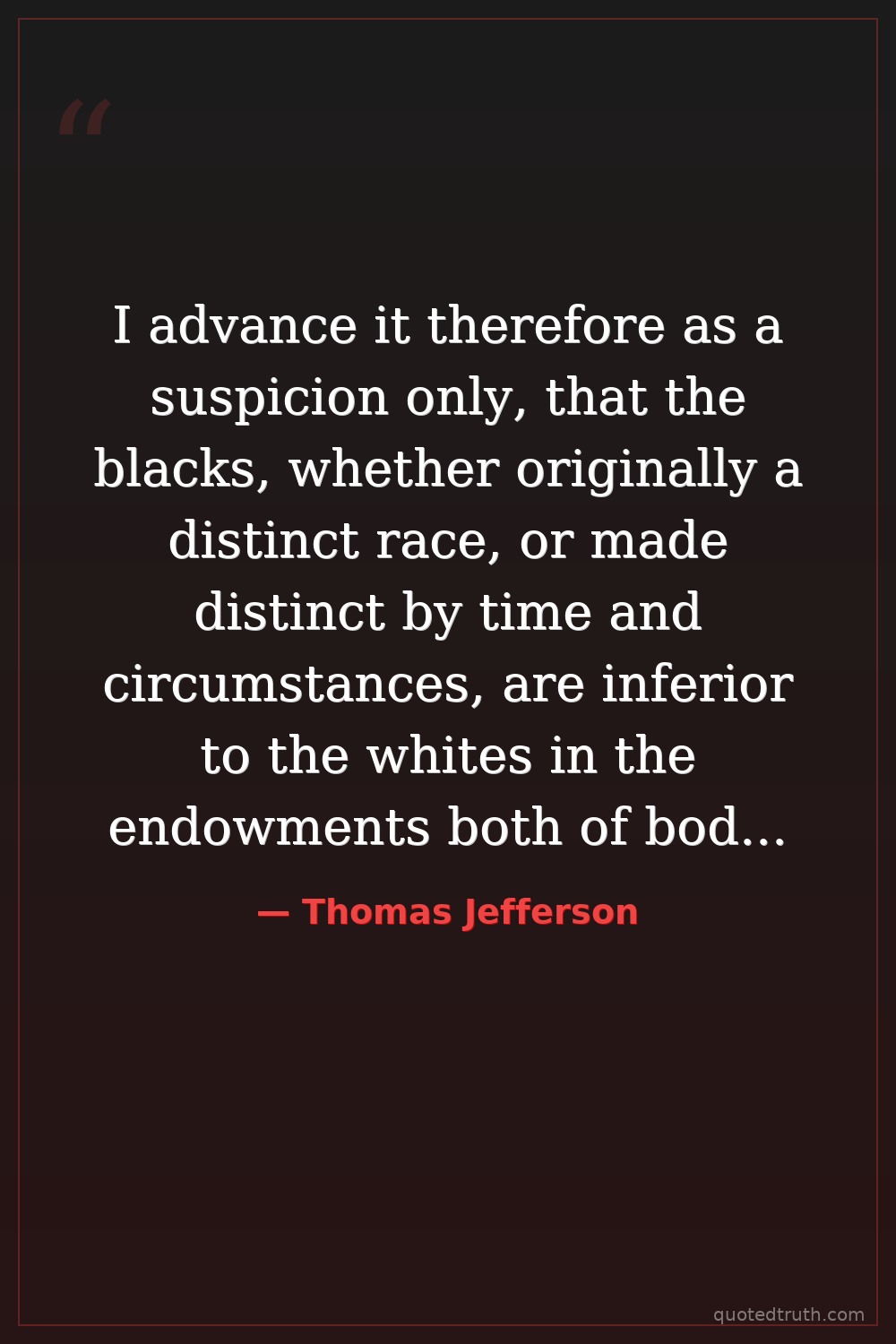 I advance it therefore as a suspicion only, that the blacks, whether originally a distinct race, or made distinct by time and circumstances, are inferior to the whites in the endowments both of body and mind.