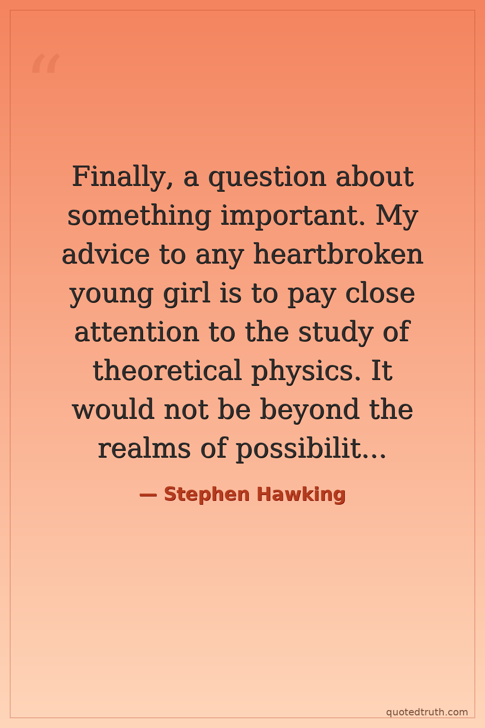 Finally, a question about something important. My advice to any heartbroken young girl is to pay close attention to the study of theoretical physics. It would not be beyond the realms of possibility that somewhere outside of our own universe lies another different universe. And in that universe, Zayn is still in One Direction.