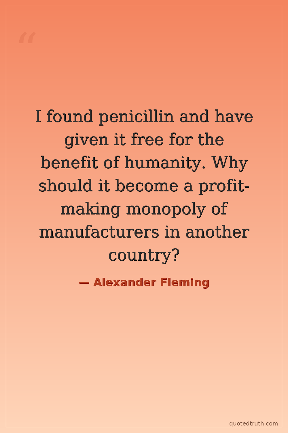 I found penicillin and have given it free for the benefit of humanity. Why should it become a profit-making monopoly of manufacturers in another country?