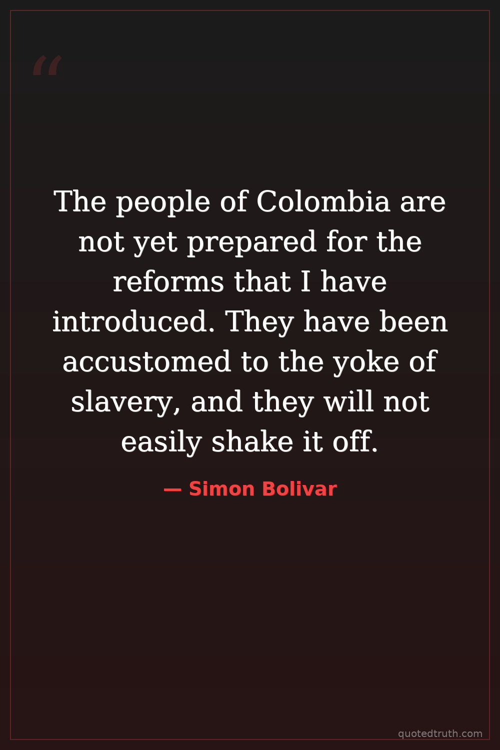 The people of Colombia are not yet prepared for the reforms that I have introduced. They have been accustomed to the yoke of slavery, and they will not easily shake it off.