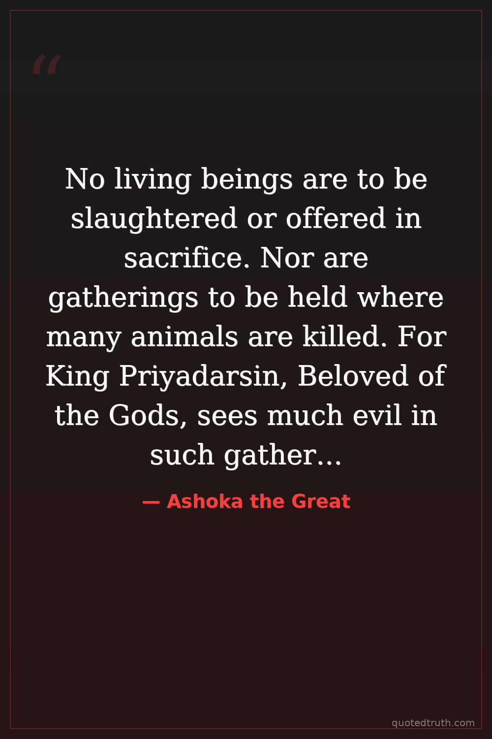 No living beings are to be slaughtered or offered in sacrifice. Nor are gatherings to be held where many animals are killed. For King Priyadarsin, Beloved of the Gods, sees much evil in such gatherings.