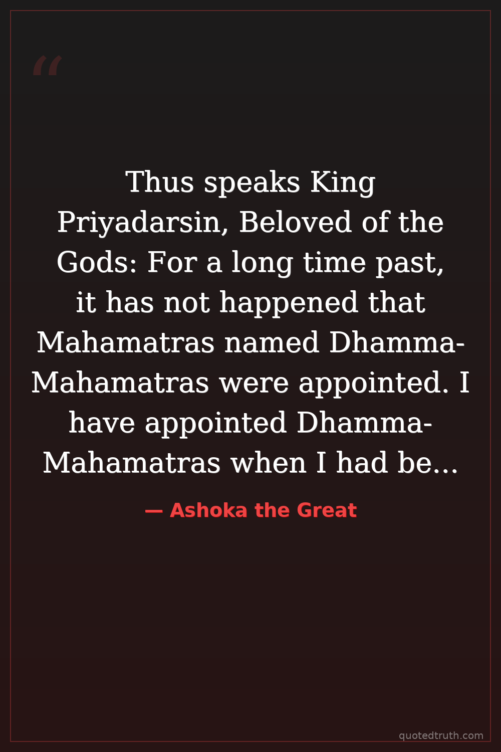 Thus speaks King Priyadarsin, Beloved of the Gods: For a long time past, it has not happened that Mahamatras named Dhamma-Mahamatras were appointed. I have appointed Dhamma-Mahamatras when I had been consecrated thirteen years.